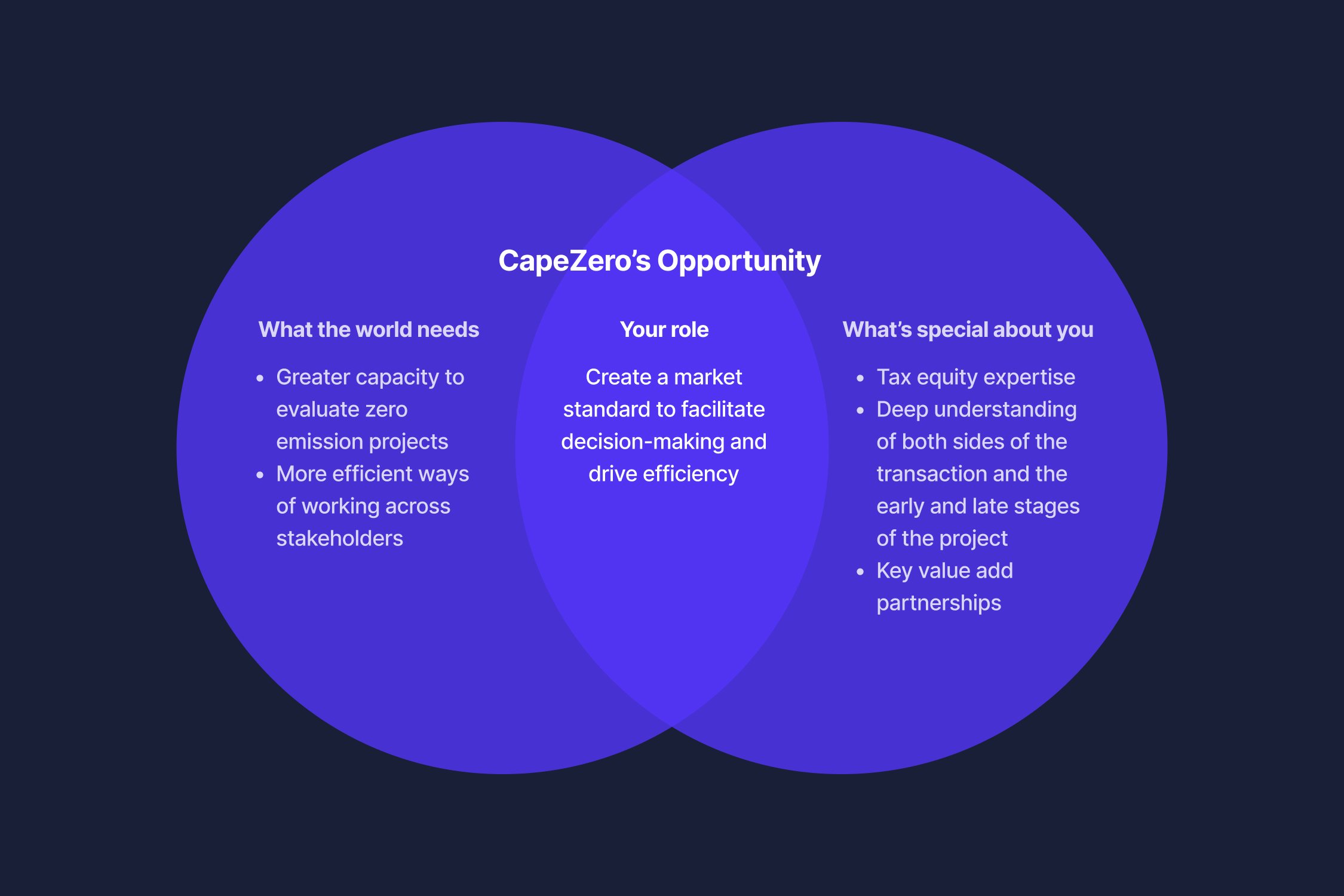 We conducted customer and partner interviews as well as a competitive review of the space and, based on CapeZero’s strengths, identified key opportunities for differentiation. By leveraging a systems-approach to tax equity transactions, they can streamline foundational financial modeling elements and create a market standard to facilitate decision-making and drive efficiency.