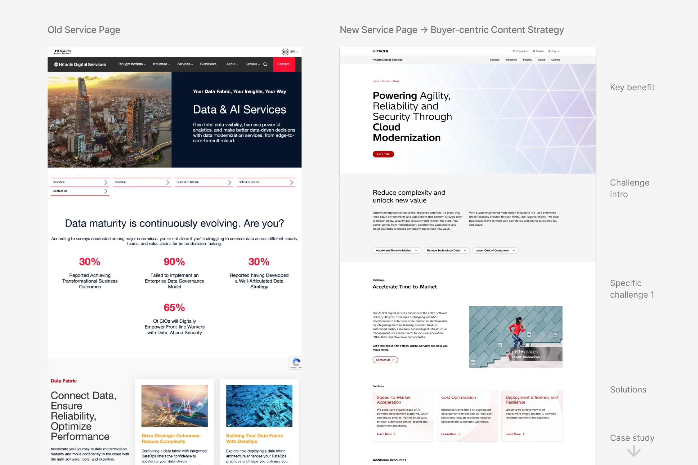 Service pages were redesigned using a challenge–solution–proof framework: